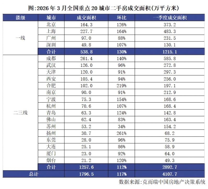数据显示,3月份全国重点20城市二手房成交面积约1797万平方米,环比倍增117%,同比增长6%。一季度累计成交面积约4108万平方米,同比正增长4%。