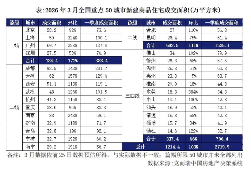 新房方面,根据克而瑞监测,3月份全国重点50城市新建商品住宅成交面积约1214万平方米,环比增加103%,同比减少27%,累计成交面积2720万平方米,累计同比跌28%,累计跌幅有所收窄。