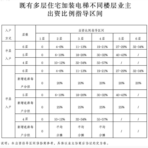 在备受关注的出资比例上,北京曾于2022年专门出台《既有多层住宅加装电梯不同楼层业主出资比例》指导区间文件,业主根据所在楼层、面积、使用率等因素分摊资金,而最终分摊比例由出资的全体业主协商确定。