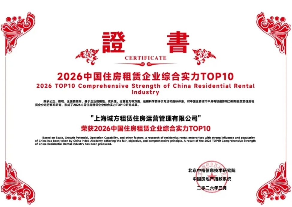 上海城方租赁住房运营管理有限公司(以下简称“城方”)凭借卓越的综合实力再度获“2026中国住房租赁企业综合实力TOP10”认证,连续三年稳居行业前十。同时,城方·黄浦璟湾社区凭借出色的产品力与运营效能,获评“2026中国长租公寓标杆项目”,充分体现行业对其品质租住生态的高度认可。